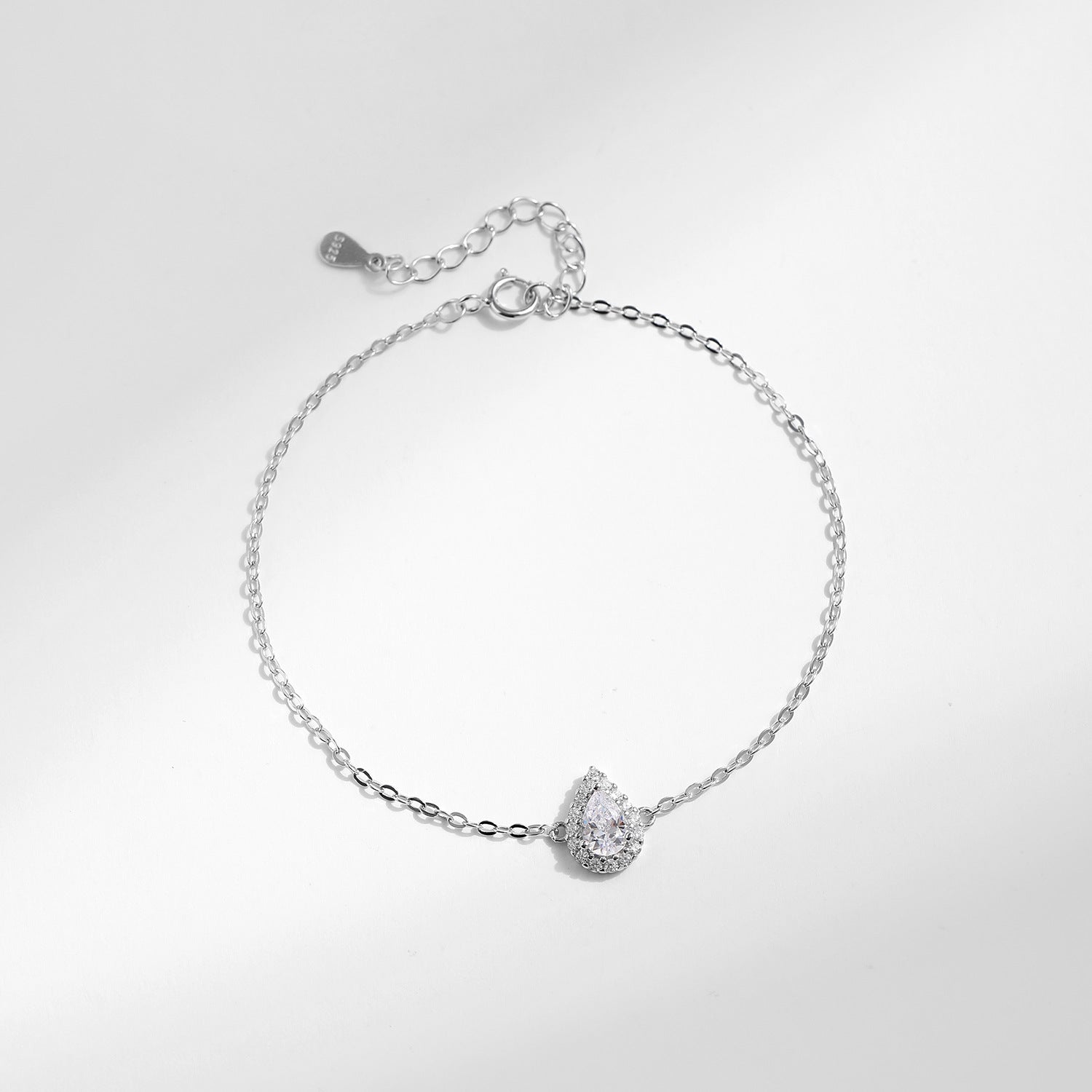 Com design delicado, a pulseira traz uma pedra central em formato de gota, rodeada por zircônias que refletem a luz de forma única. Um acessório perfeito para elevar sua beleza com sutileza e elegância.
